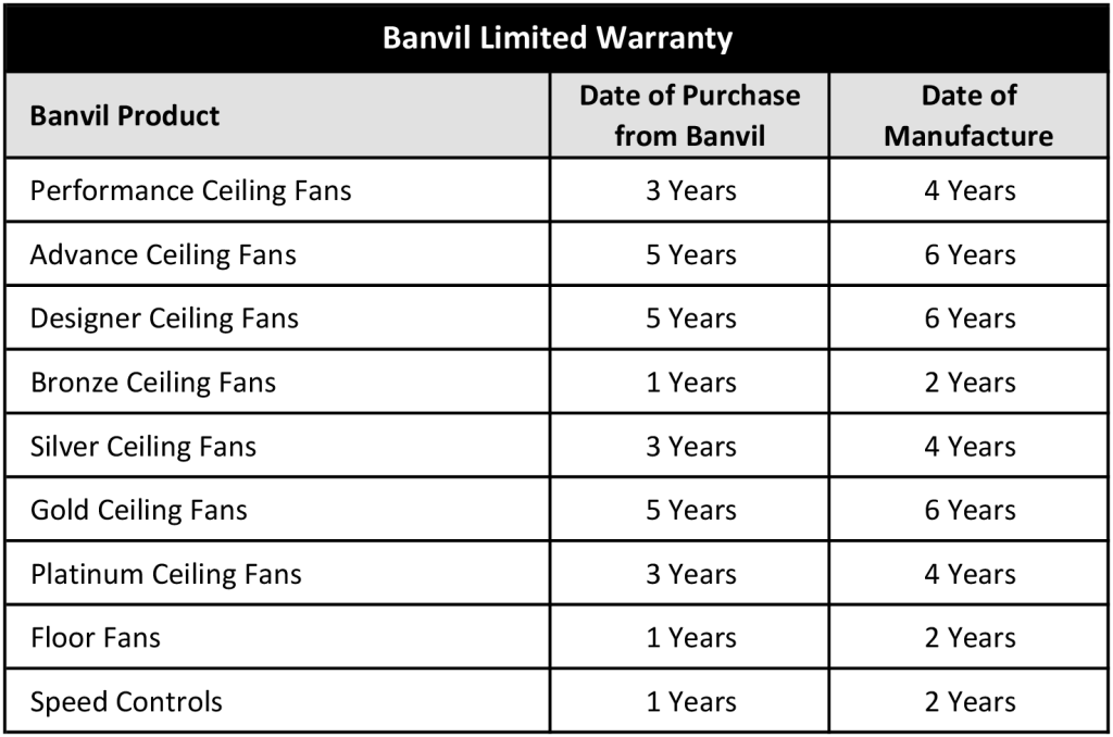 Banvil warrants to the original purchaser for the period stated in the chart below. Banvil will, at its discretion, repair or replace the fan if it malfunctions or fails due to defects in workmanship or materials. This warranty does not cover labor costs associated with the removal, reinstallation, freight and any other transport charges.