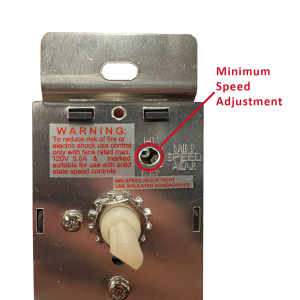 - Locate and adjust minimum speed setting on front plate with small screwdriver (rotate clockwise to decrease minimum speed; counterclockwise to increase minimum speed). Special Note: For 2.5 and 3.0 Amp models, adjustment of minimum speed is reversed. Rotate clockwise to increase minimum speed; counterclockwise to decrease minimum speed. On some models minimum speed adjustment hole is located on side of control.